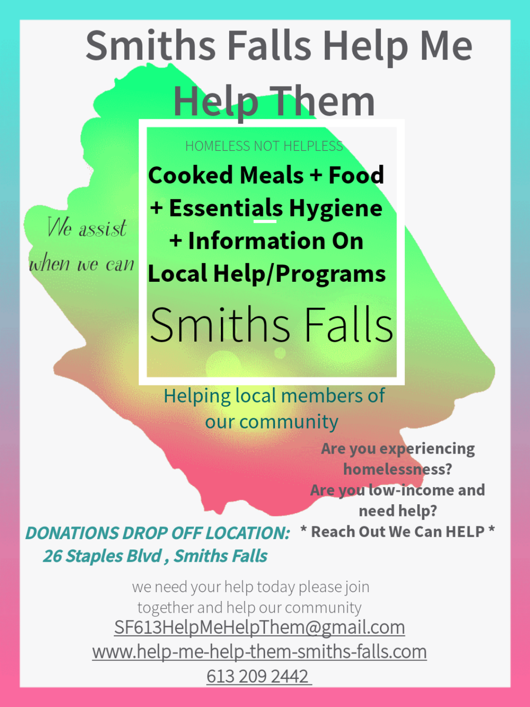 Food Delivery Drop-off location can be found on Facebook: “Smiths Falls help me help them.”